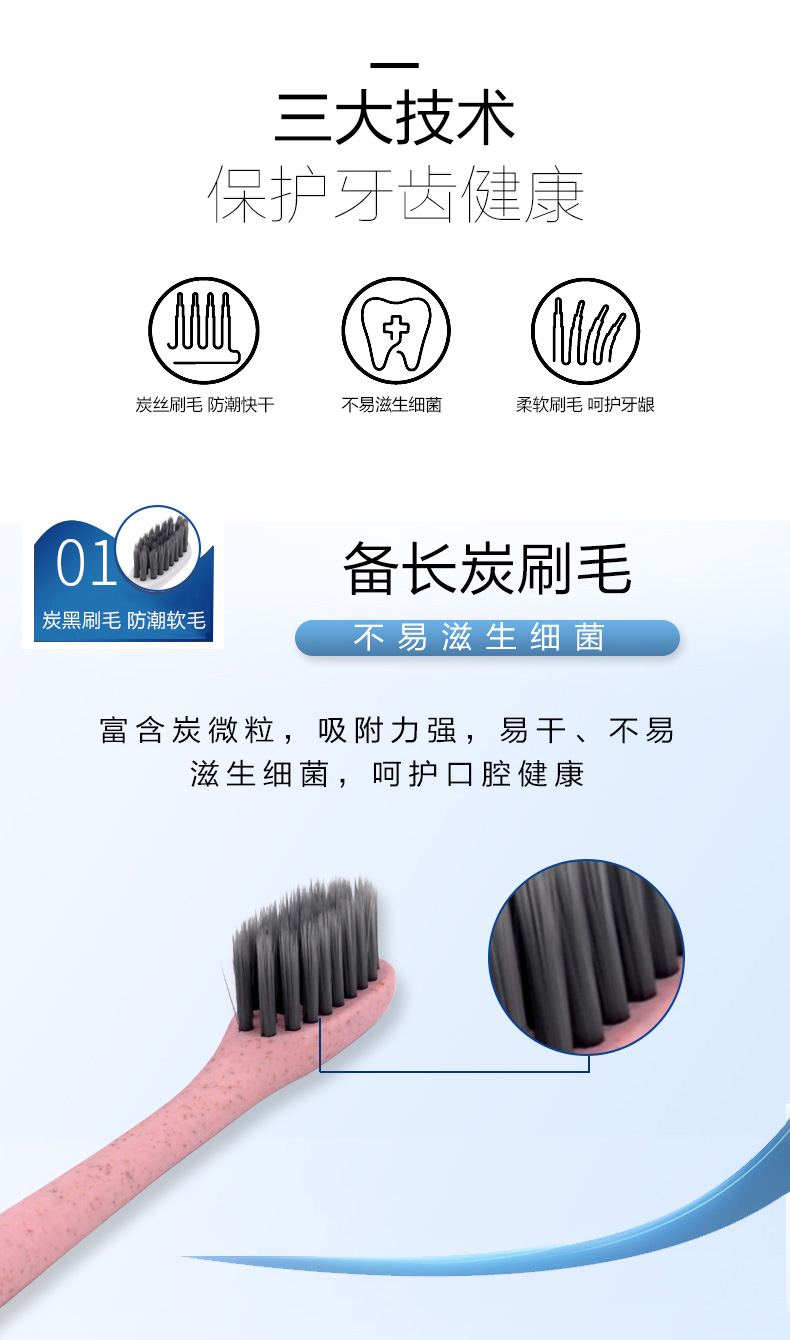 防潮,快干、深层清洁、小刷头更灵活、环保刷柄